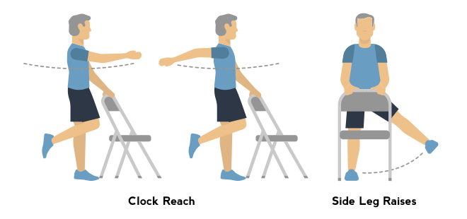 Use a chair as a place to not only perform seated exercise but also to hold on to while standing. Hold on with your finger, one hand or two hands. Always get up slowly when rising from a chair.
